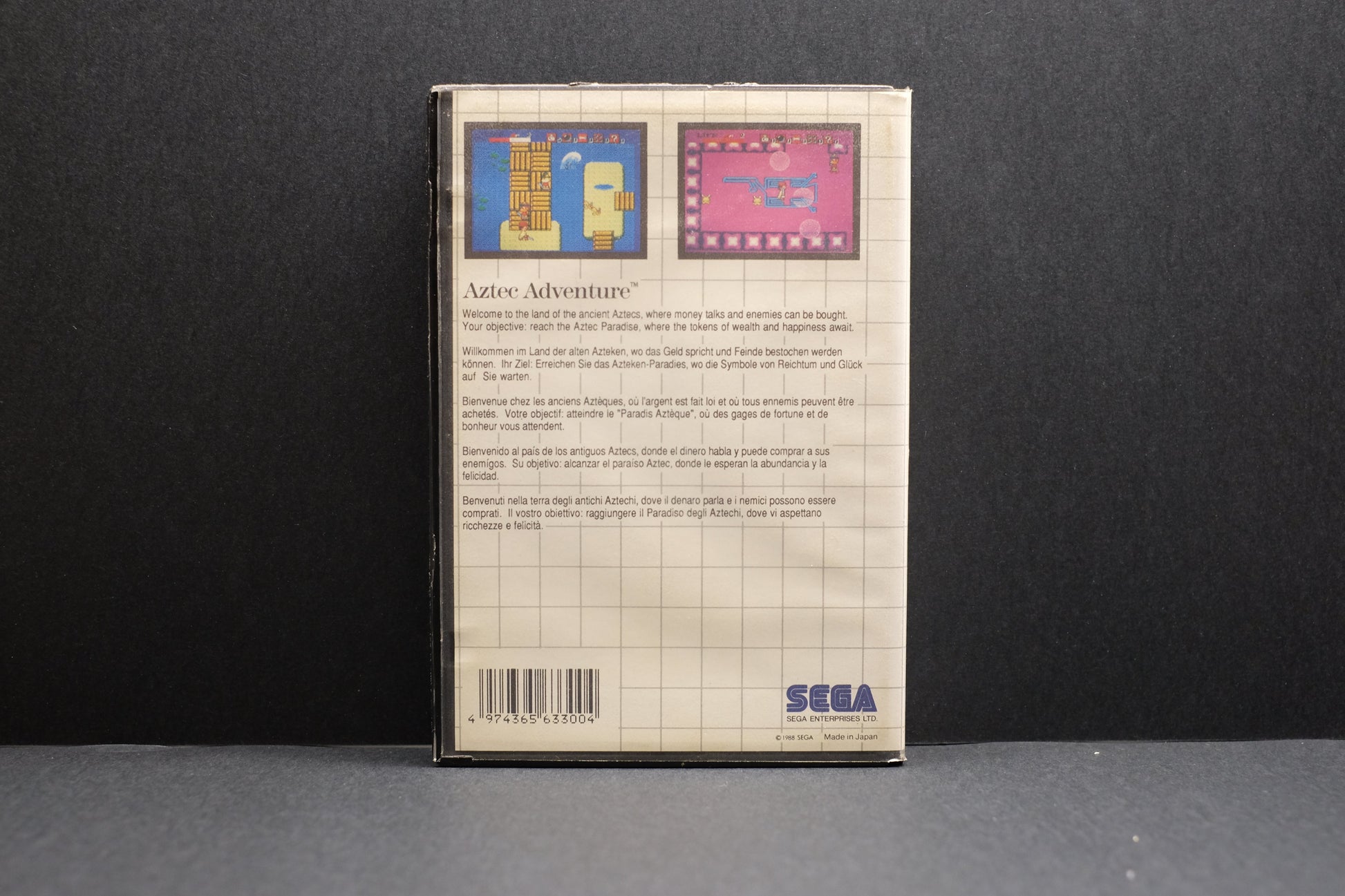 Aztec Adventure, known in Japan as Nazca '88: The Golden Road to Paradise, an action video game that was developed and published by Sega for the Master System. In the game, the player takes the control of Niño, an adventurer who must traverse a maze in search for treasures.