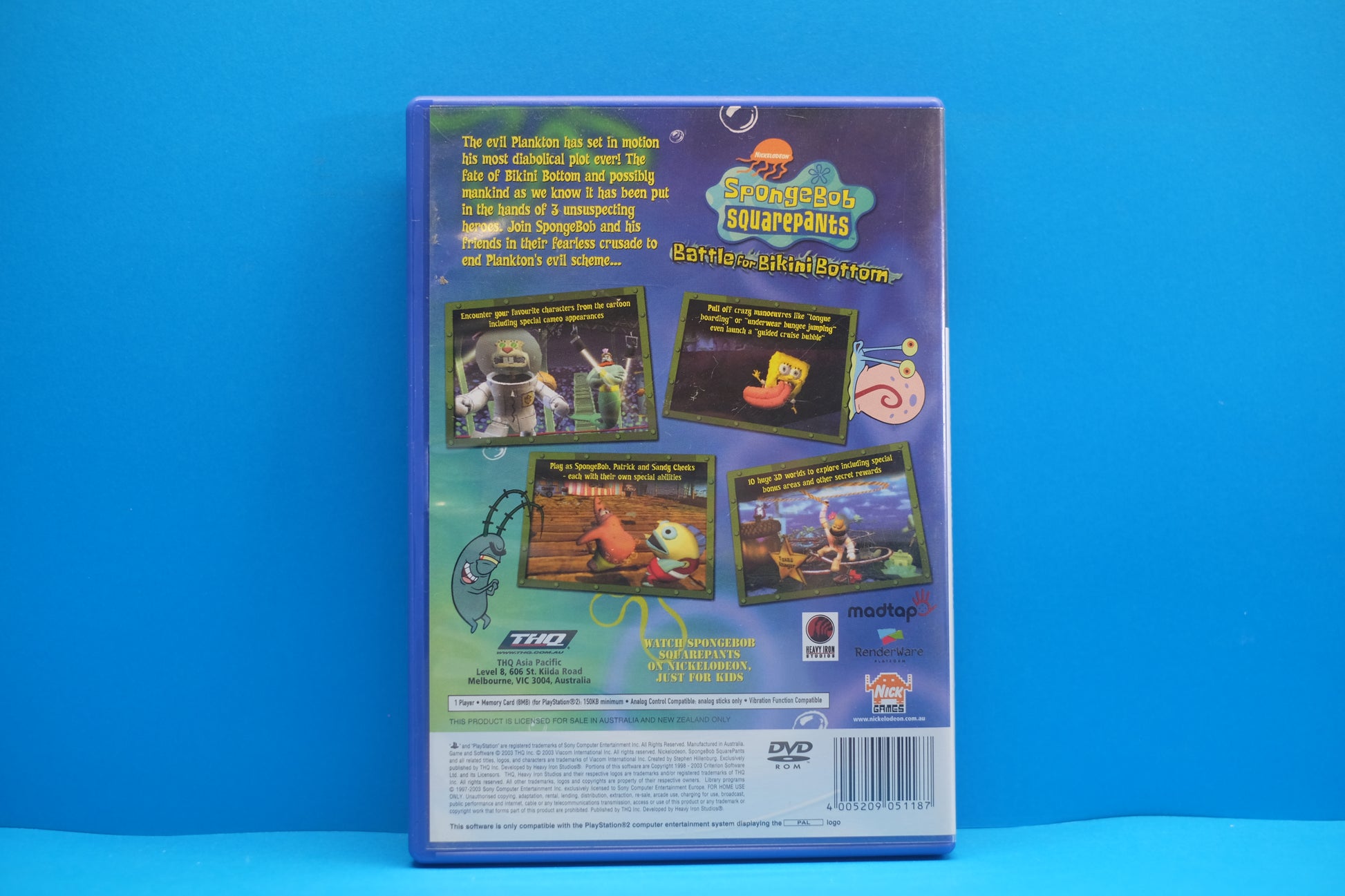 SpongeBob SquarePants: Battle for Bikini Bottom is a platform video game based on the Nickelodeon animated series SpongeBob SquarePants, developed by Heavy Iron Studios and published by THQ for the PlayStation 2.